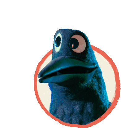 A dark blue magpie puppet from Robin Robin looks quizzical and curious, tilting its head slightly.