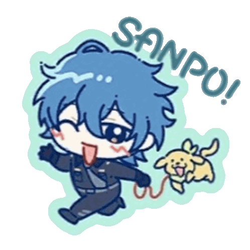 a cartoon of a boy walking a dog on a leash with the word sanpo written above him