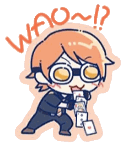 a cartoon character with glasses is holding a stack of playing cards and the word wao is above him