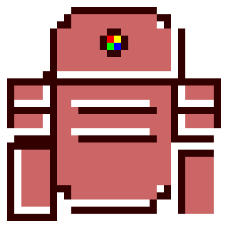 A pixel art R2-D2-like robot with a red body and a multi-colored eye that blinks, perfect for sci-fi fans.