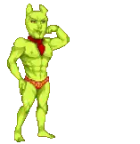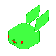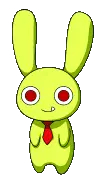 A green, pixel-art-style rabbit-like object, known as a Grunny, with red markings and two upright ears, referencing Rabbit R1.