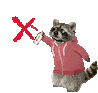 A pixel art raccoon in a pink hoodie sprays a red X with a spray can, creating graffiti.