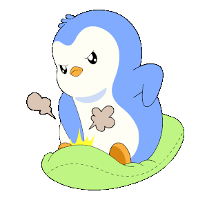 An angry blue and white cartoon penguin sits on a green cushion, showing intense rage and frustration with puff clouds.