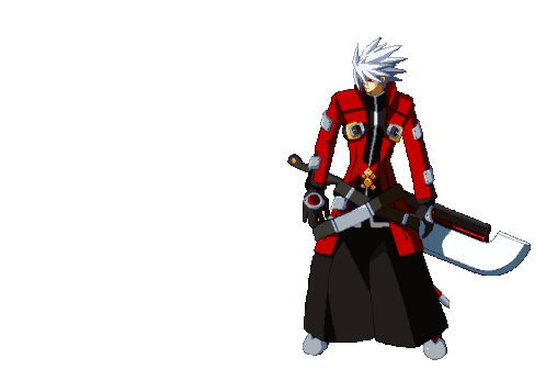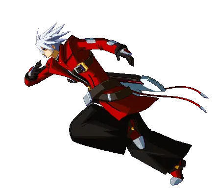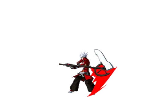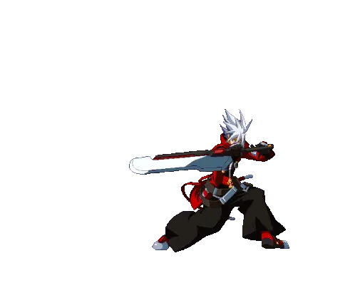 Ragna Bloodedge from BlazBlue performs a series of dynamic combat moves, including a dash, sword swings, and powerful attacks.