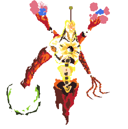 A pixel art animated sticker of the Ragna Boss, a complex monster with fiery limbs and a speech bubble saying 'I W'.