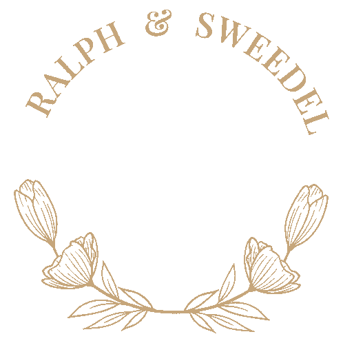 An elegant animated logo sticker for Ralph & Sweedel, featuring their initials RS and a delicate floral wreath design.
