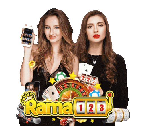 two women holding a phone and a slot machine with the word rama 123