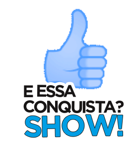 A blue fist transforms into a sparkling thumbs-up emoji with the Portuguese text 'E Essa Conquista? Show!' celebrating achievement.