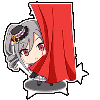Ranko Kanzaki, the Idolmaster character, appears in chibi form, peeking from behind a red curtain with a playful expression.
