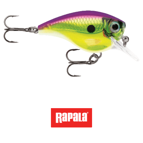 A vibrant Rapala fishing lure, featuring a purple, green, and yellow design, complete with hooks, perfect for anglers.