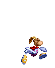 Rayman, the iconic limbless hero, is depicted in a vibrant pixel art running animation, showcasing his unique movement style.