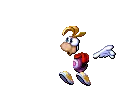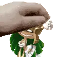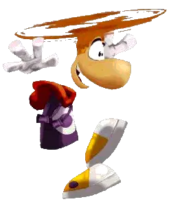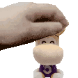 A hand gently pats a cute Rayman plushie wearing a purple shirt, a comforting and playful animated sticker.