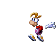 Rayman, the iconic limbless hero, performs his signature flying move as a pixelated sprite. A classic video game character sticker.