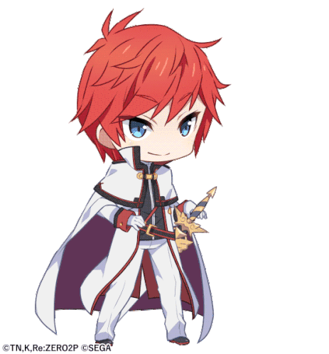 Re:Zero's Reinhard van Astrea in chibi form, holding a sword with the text 'よろしく頼むよ'.