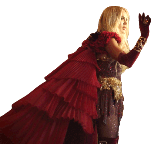 Carrie Underwood, in a stunning red tiered gown and gloves, reaches upwards with her hand, embodying a powerful and dramatic pose.