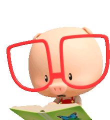 Piggy, the cute cartoon pig, is engrossed in reading a green book with a butterfly illustration, wearing red glasses.