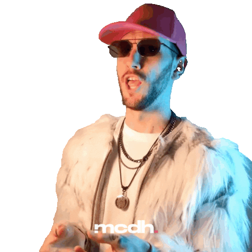 a man wearing sunglasses and a fur coat has the word mcdh written on the bottom