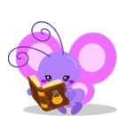 A cute purple butterfly from Galinha Pintadinha is engrossed in reading a brown cookbook with a steaming pot on its cover.