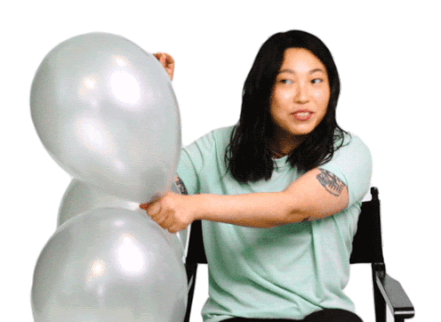 Awkwafina playfully asks 'Ready?' while holding two silver balloons, anticipating a fun moment or a pop quiz.
