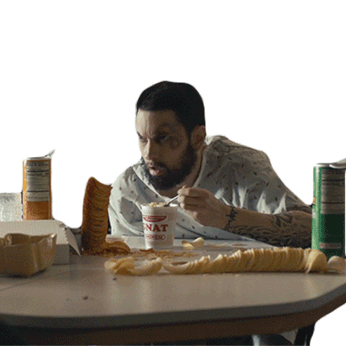 Eminem, eating instant noodles, has a sudden moment of realization or surprise, looking up with wide eyes.