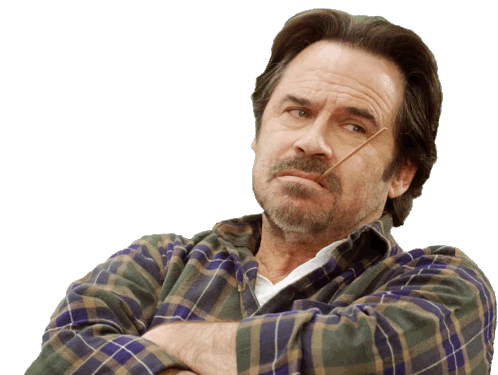 Dennis Miller, in a plaid shirt with arms crossed, holds a toothpick and gives a thoughtful, skeptical look.
