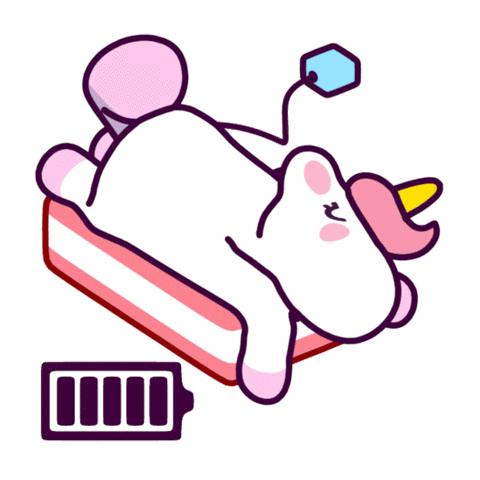 A cute, tired unicorn lies down, plugged into a charger, with a low battery icon indicating it needs to recharge its energy.