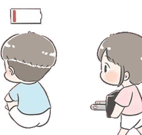 A cute girl 'recharges' a tired boy by plugging him in, then offers a comforting hug as his energy returns.
