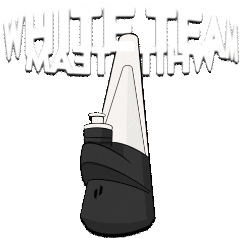 A stylized black and white drawing of a Puffco Peak bong, featuring rotating text 'White Team' and 'Team Masters'.