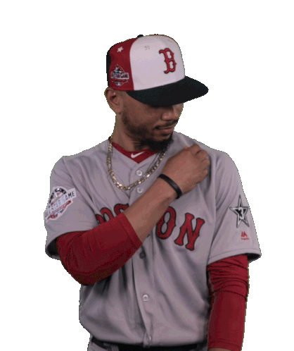 Mookie Betts, wearing a Boston Red Sox uniform, smiles and performs a confident "brush it off" gesture.