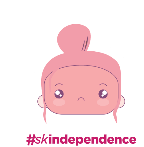 A cute cartoon face with pink hair washes away worries, revealing sparkling clean skin and a happy smile, celebrating #skindependence.