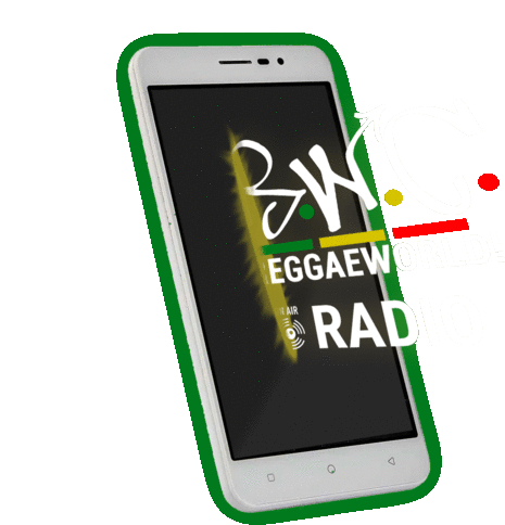 Animated sticker of a smartphone displaying the Reggae World Radio logo, perfect for music lovers and dancehall fans.