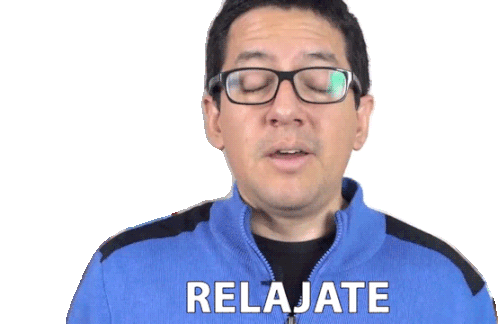 Aldo Bartra from El Robot De Platón tells you to 'Relajate' (Relax) with a friendly smile, encouraging calm.