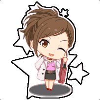 Rena Hyodo, a cute chibi anime girl, smiles while wearing a lab coat and holding an umbrella, surrounded by stars.