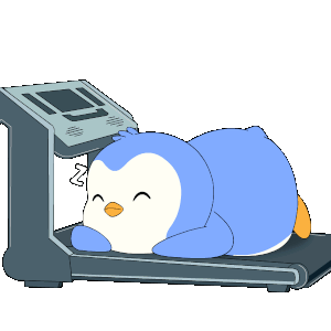 A cute blue and white penguin happily napping on a treadmill, enjoying a well-deserved rest day with 'zzz' symbols.