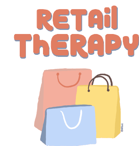 A stylized character with a shopping bag head happily walks with multiple shopping bags, representing retail therapy.