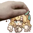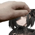a hand is putting a hat on a girl 's head in a pixel art style .