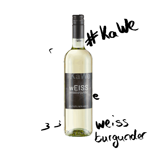 A bottle of Kawe Weissburgunder wine from Rewekramer, surrounded by handwritten German text like "rein", "ehrlich", and "#Kawe".