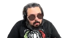 Rico Agbin3r, a bearded man in sunglasses and headphones, makes a delicious gesture by licking his fingers with an expressive look.