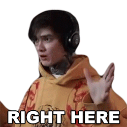 Tim Henson, wearing headphones and a yellow hoodie, gestures with both hands while the caption 'RIGHT HERE' appears.