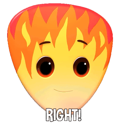 Blippi-inspired animated fiery guitar pick character with a happy expression, displaying the word 'RIGHT!'.
