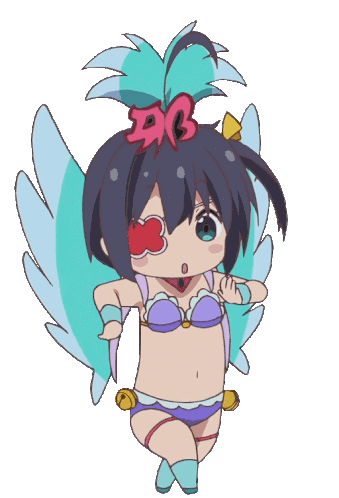 Rikka Takanashi, the adorable chibi character, dances energetically in a purple bikini with vibrant wings.