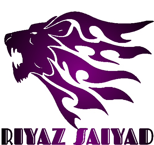 a logo for riyaz jaiyad shows a lion with flames coming out of it 's mouth