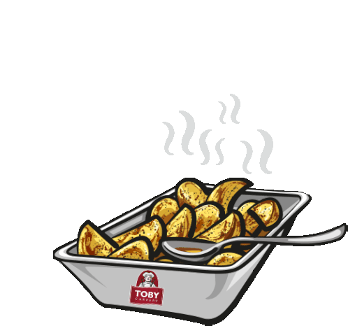 An animated sticker featuring a steaming dish of hot roast potatoes from Toby Carvery, perfect for a roast dinner.