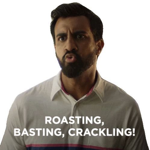 Oscar Finley Cullen reacts with wide eyes to the mention of roasting, basting, and crackling, expressing surprise.