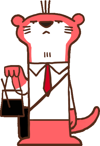 Robert The Otter, a cartoon character, stands with a straight face, wearing a suit, tie, and holding a briefcase.