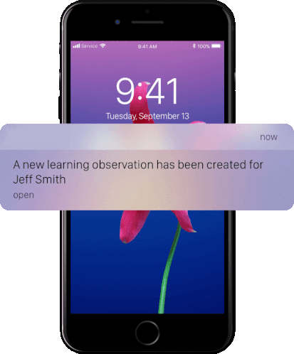 a phone with a notification that says a new learning observation has been created for jeff smith open