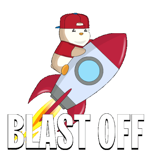 A cute Pudgy Penguin cartoon character rides a rocket, blasting off into the sky with 'BLAST OFF' text.