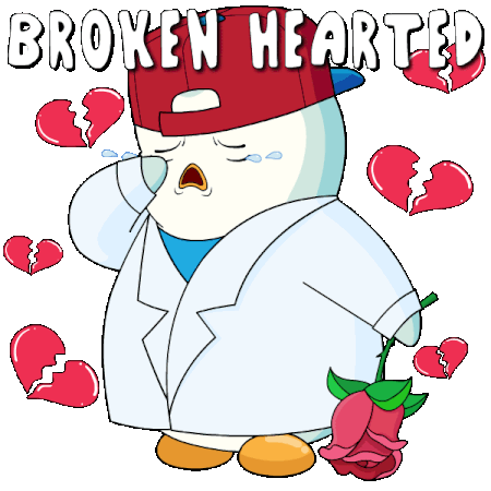 A cute penguin holds a heart, initially pierced by one arrow, then two, as its expression turns from neutral to sad, symbolizing heartbreak.