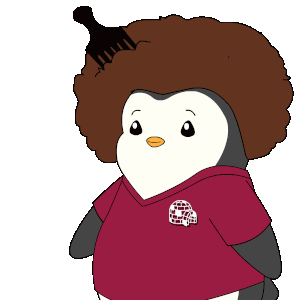 A cute cartoon penguin with a fluffy afro and a red shirt, smiling happily, then showing heart-shaped eyes, expressing love and affection.
