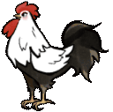 An animated cartoon rooster with white and black feathers, a red comb, and wattles stands proudly.